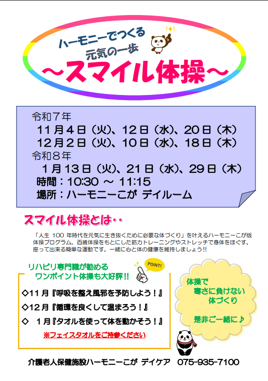 ハーモニーこが ~好評開催中★申し込み不要「スマイル体操」11・12・1月のお知らせ~